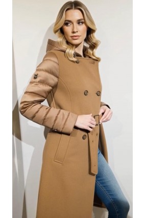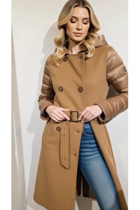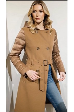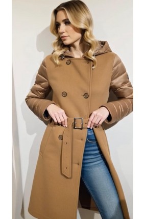 Abrigo MARKUP marrón camel combinado en paño elástico, cuello a la caja, capucha incorporada en tejido de plumífero , manga larga en tejido de plumas acolchadas, cierre de doble botonadura, cintura con pasantes y cinturón con hebilla metálica ,bolsillo francés.MW9640021