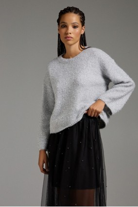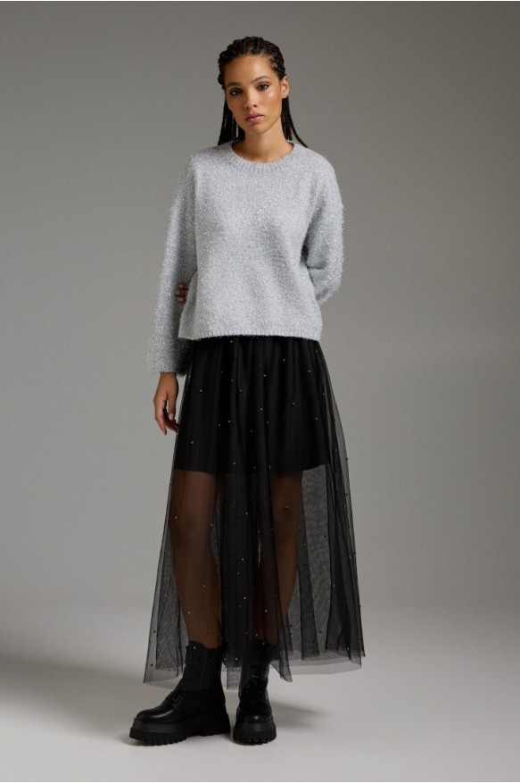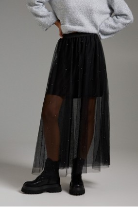 Falda BSB Fashion confeccionada en tejido de tul en color negro con cuentas plateadas, cintura elástica y forro interior , diseño recto.052-213025
