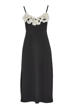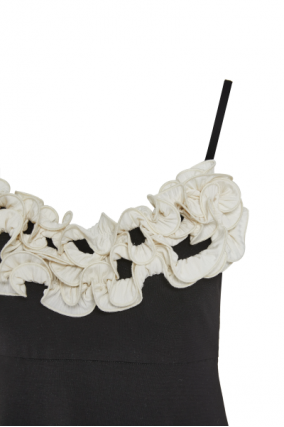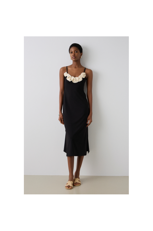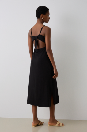 Vestido midi negro de BSB es sofisticado con un toque original, su tejido ofrece una caida fluida con un ajuste cómodo que realza la silueta sin marcar. Su escote decorado con volantes en tono crudo con tirantes finos. La espalda abierta con lazo aporta un aire elegante y femenino. Perfecto para ocasiones especiales y look de verano.