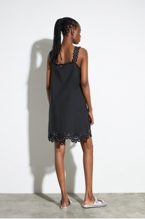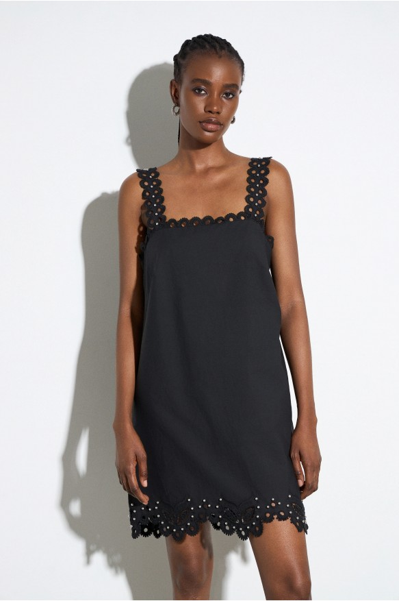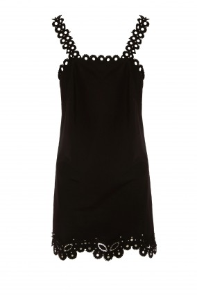 Vestido BSB negro corto con bordados en bajos y tirantes, detalle de piezas en plateado, corte recto ideal para este verano.